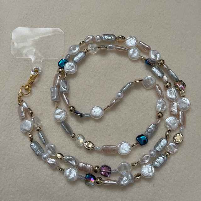 様々な形状のパールビーズを使用したスマホショルダーストラップです。 ショッピングは手ぶらでスマホ決済でき、キャンプやスポーツ観戦時も手軽にカメラが使え、公園で大きな荷物は置いたままスマホは持ち歩けるといった便利な商品です。 ※スマホで使用するためのストラップホルダーも一緒におつけいたします。 ケースは付属しておりませんのでご注意ください。 お持ちのケースに取り付けてお使い頂けます。 長さ約120cm