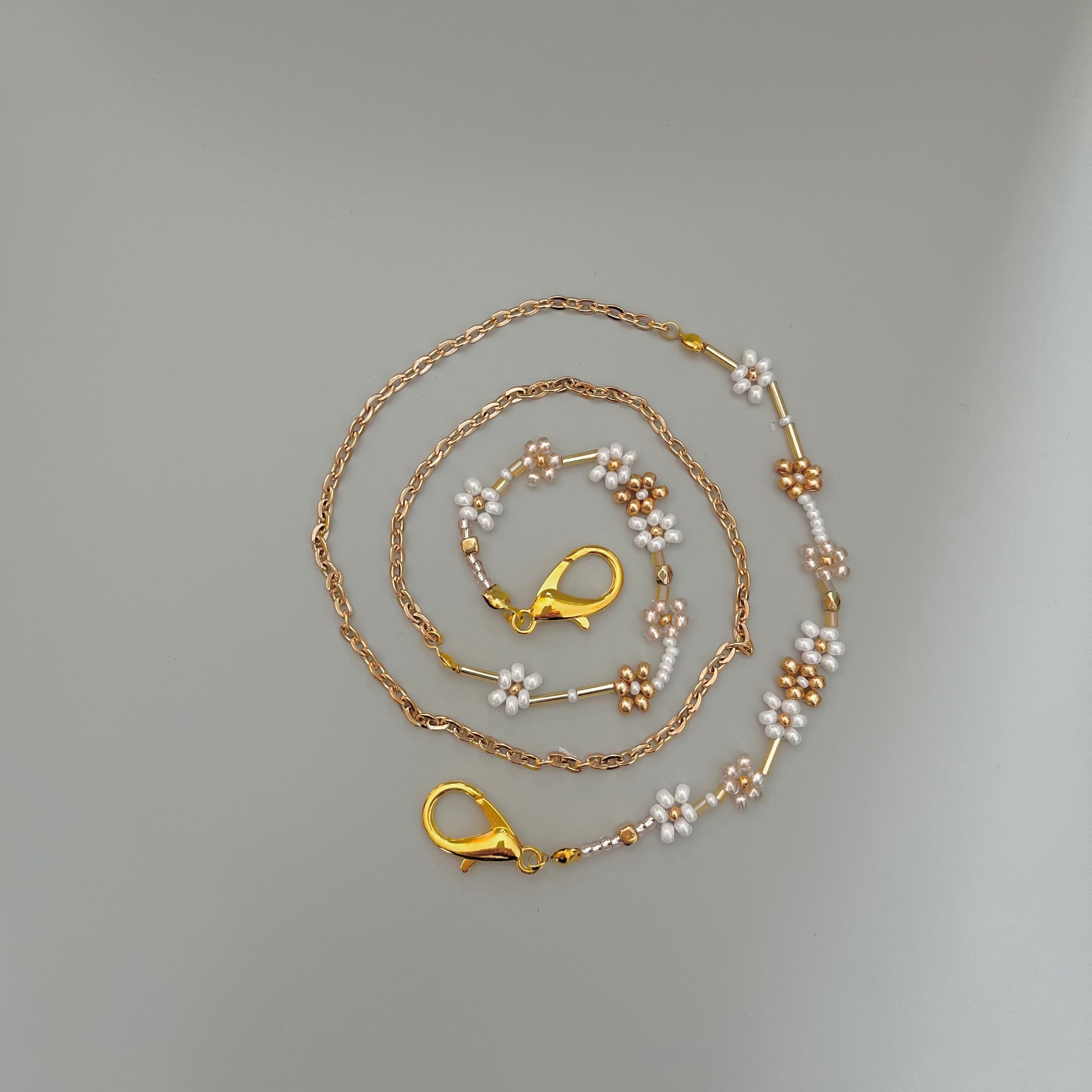 お花のモチーフやビーズを使用して、首まわりは可愛いチェーンにしました。