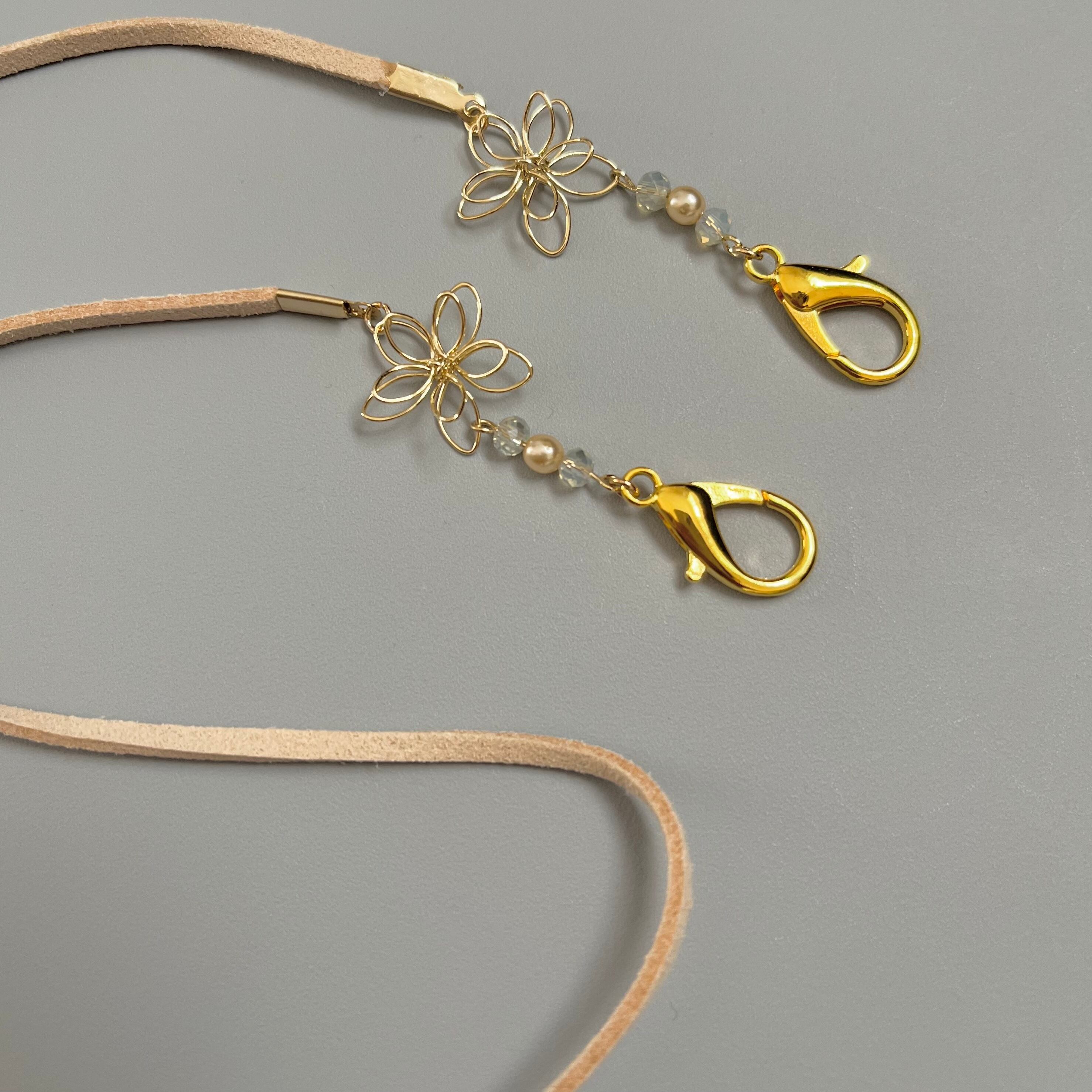 スエード調の紐とフラワーワイヤーを使用したマスクストラップです。