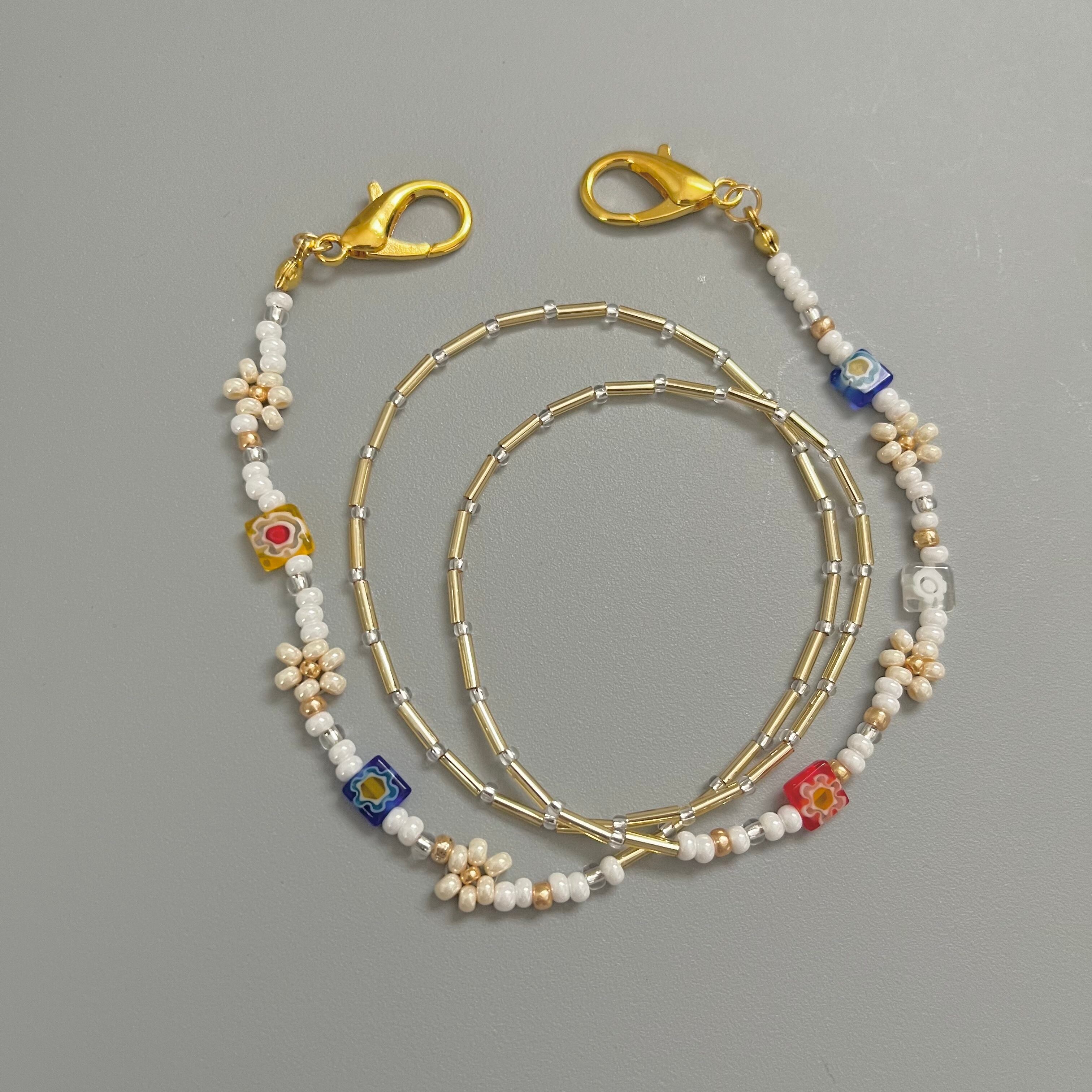 スクエアのミルフィオリビーズとお花を使用したマスクストラップです。