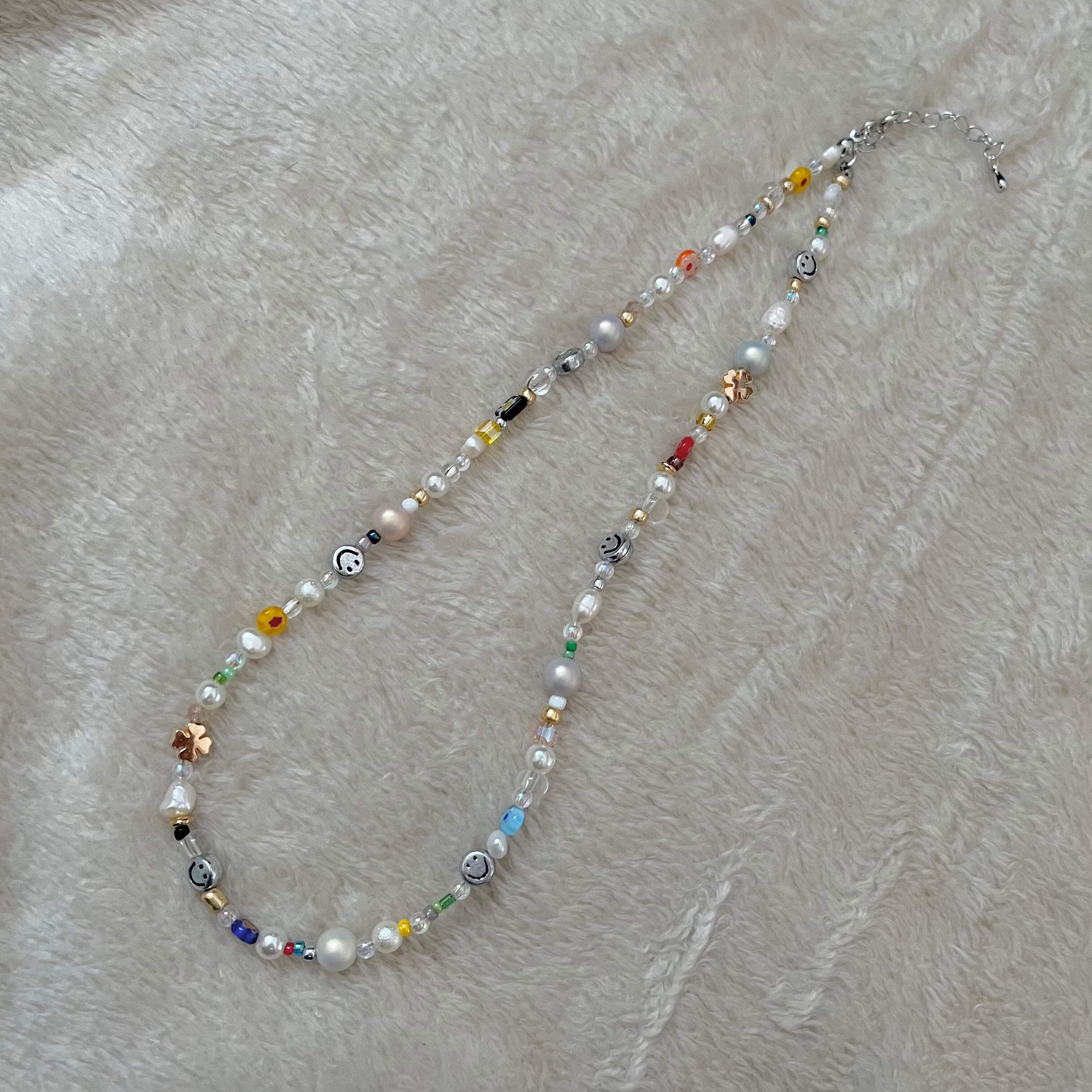 スマイルビーズやミルフィオリビーズ、淡水パールを使用し、カラフルに仕上げました。