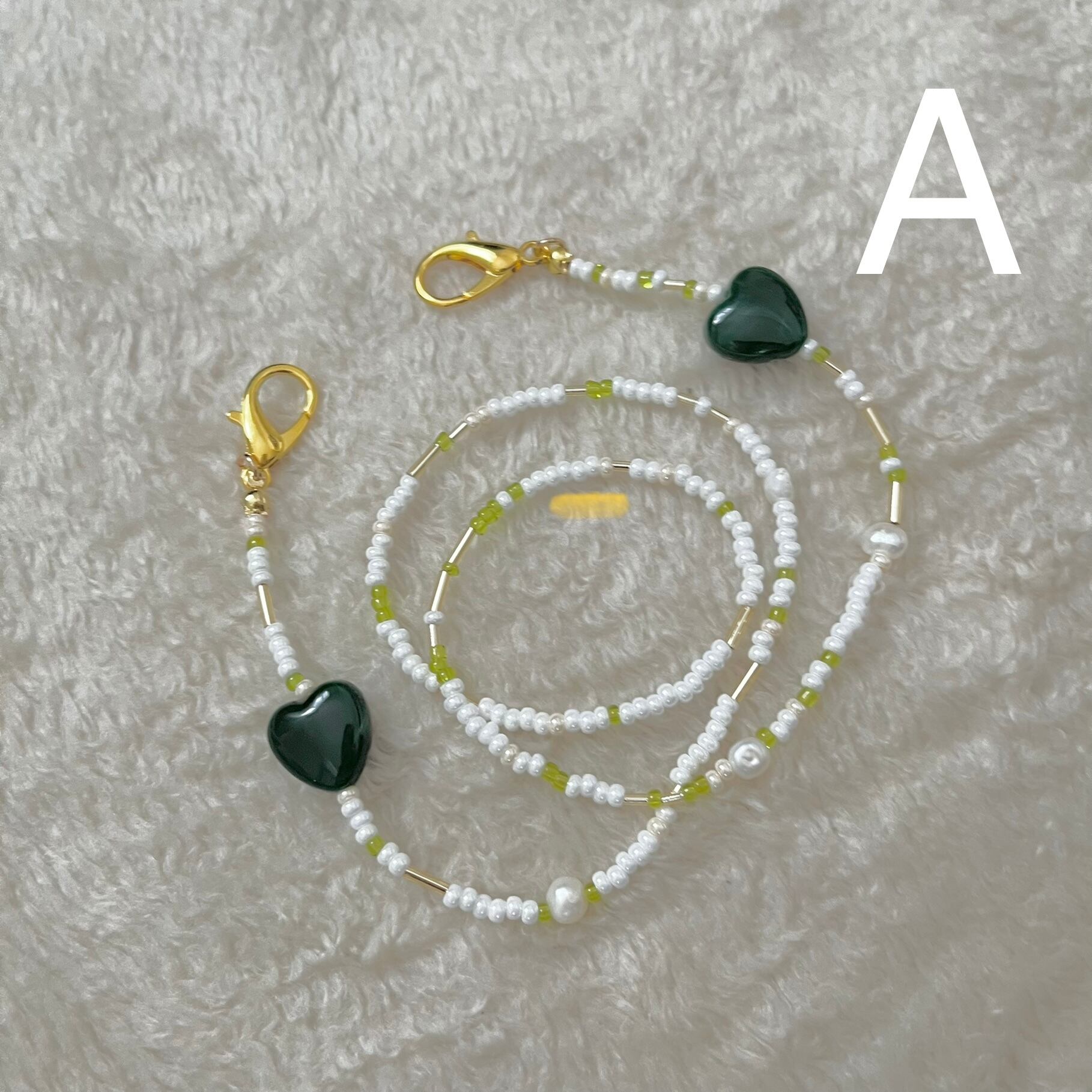 グリーンのハートと淡水パールを使用したマスクストラップです。