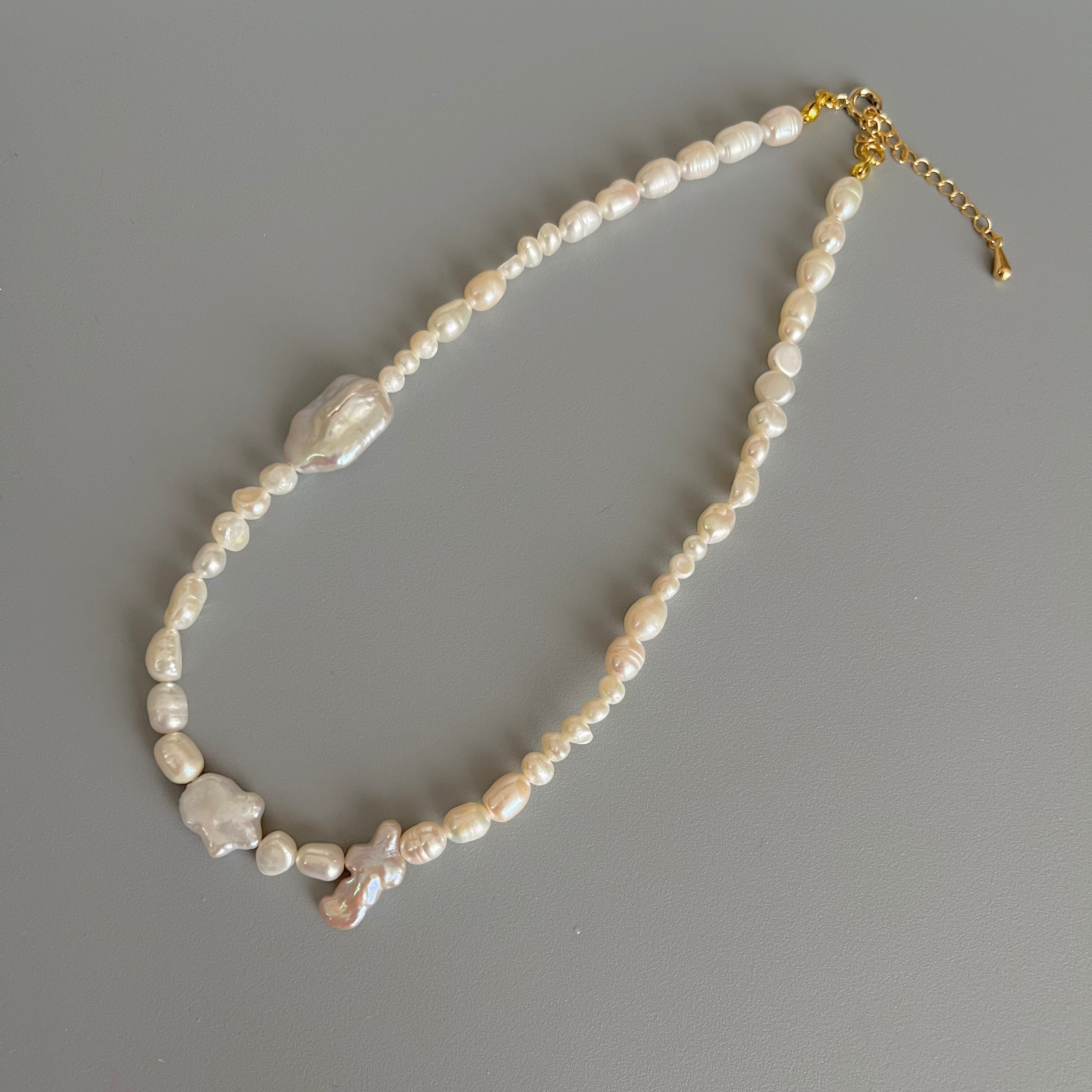 大きさが違う淡水パールを使っているので、シンプルだけどインパクトのあるアイテムです。