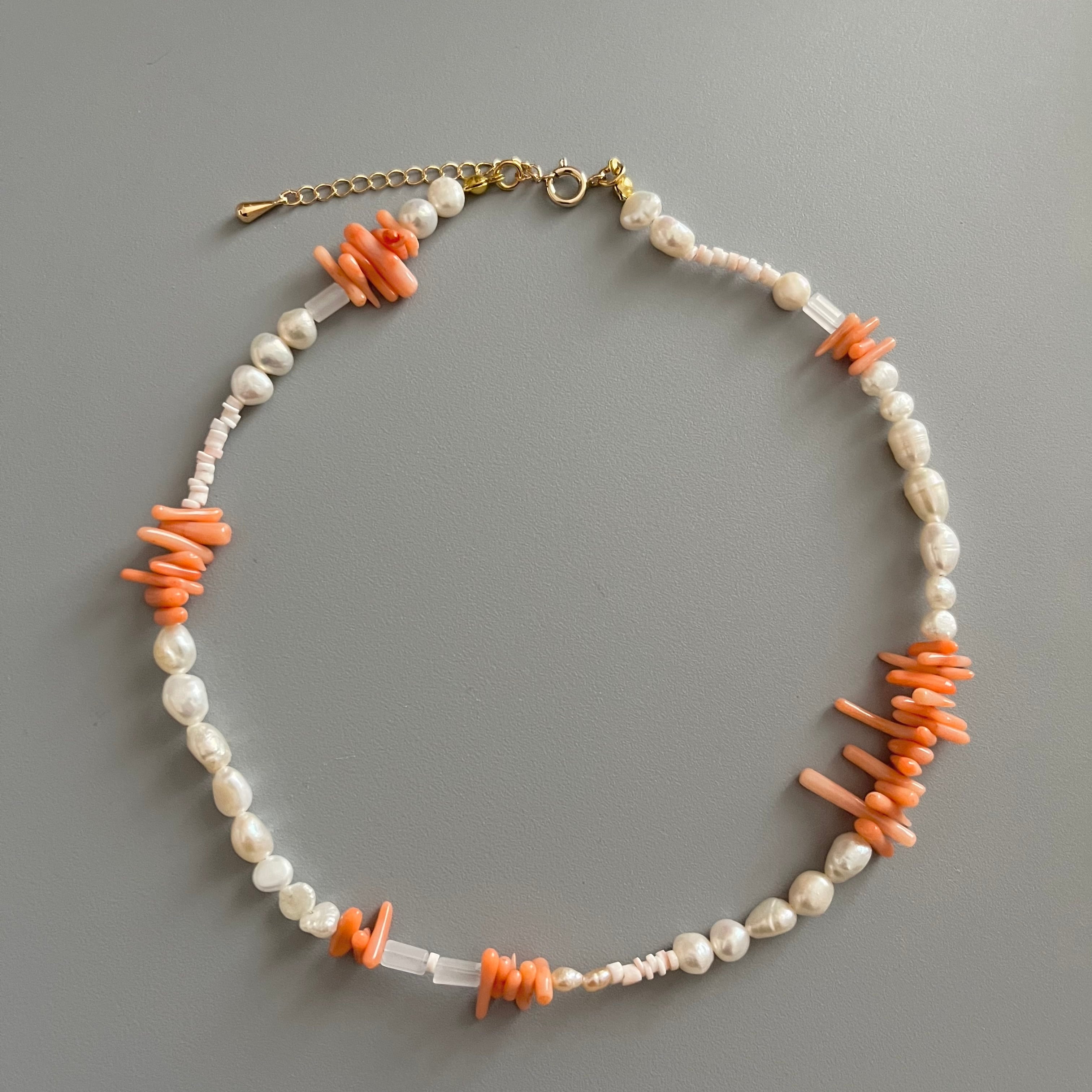 淡水パールとシェル、サンゴを使用したネックレスです。