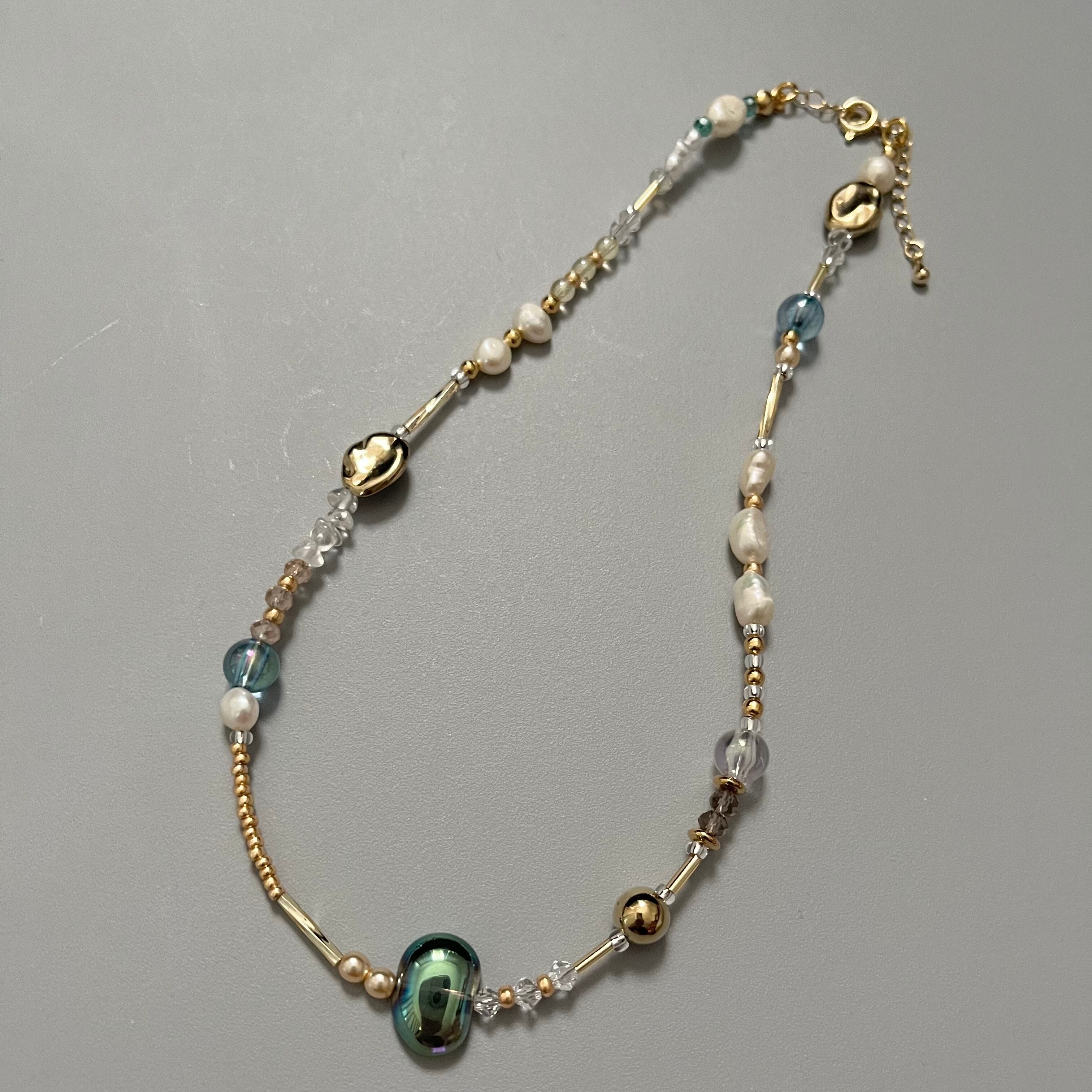 淡水パールや水晶など様々なビーズを使用したネックレスです。