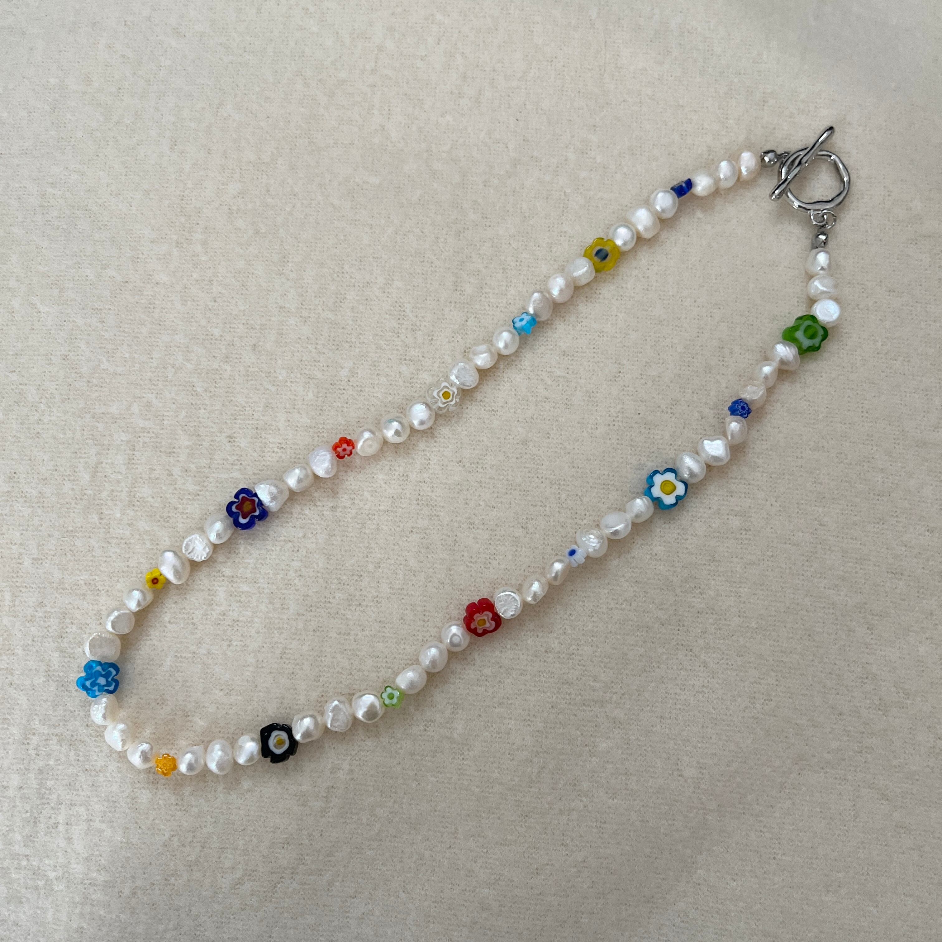 ミルフィオリビーズや淡水パールを使用し、カラフルに仕上げました。
