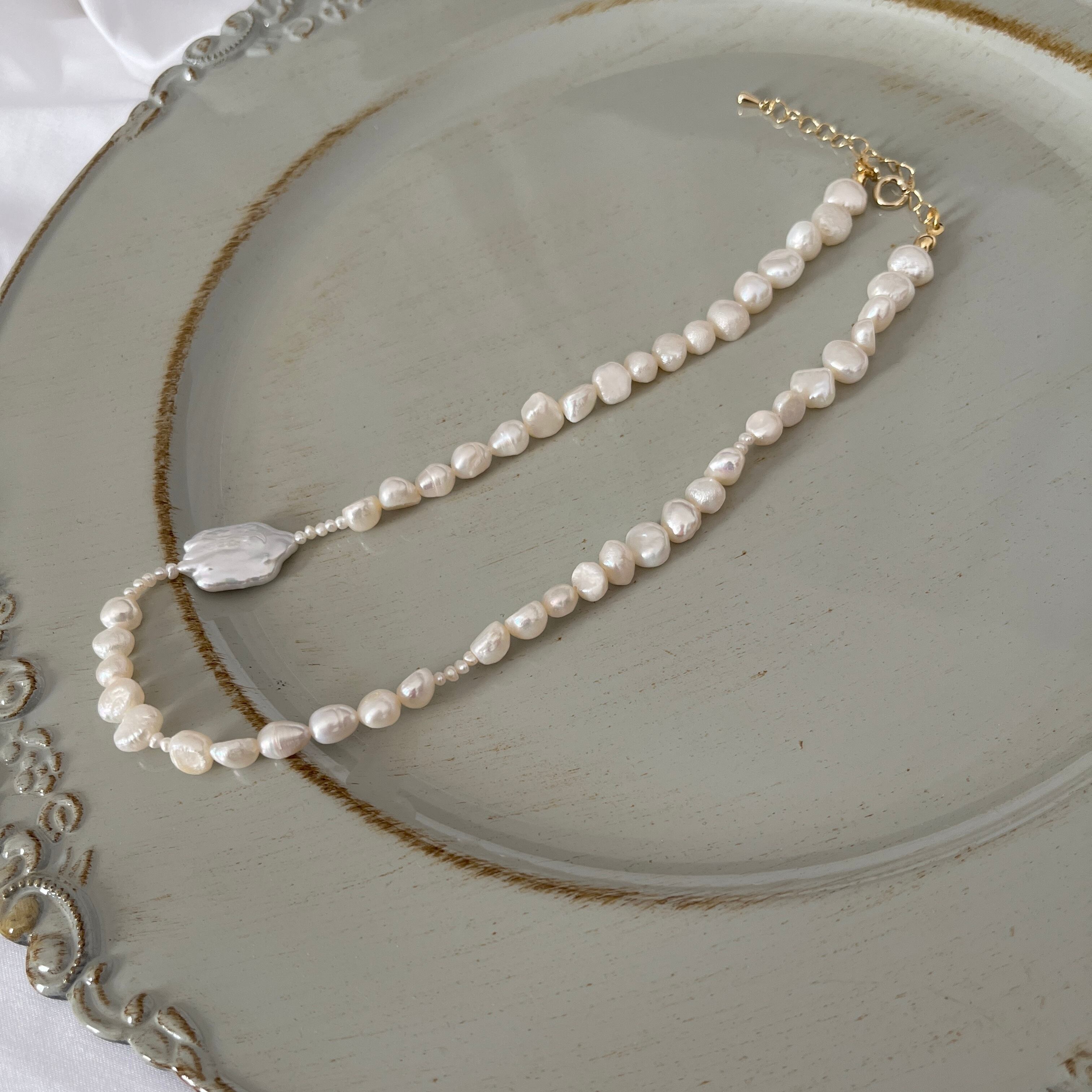 大きさが違う淡水パールを使っているので、シンプルだけどインパクトのあるアイテムです。